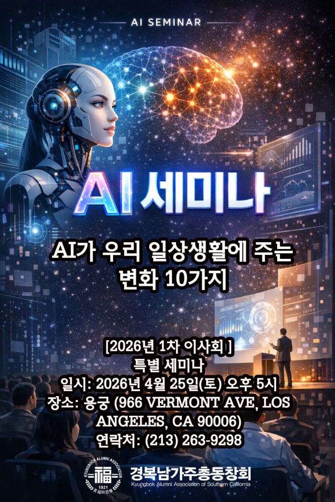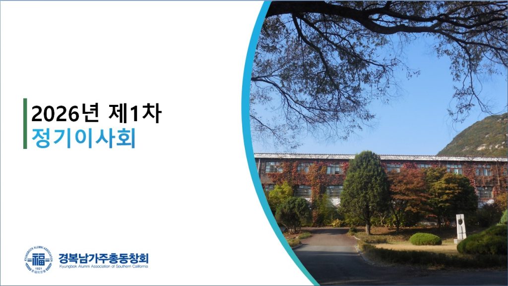 2026년도 제1차 이사회안내 안녕하십니까. 경복 남가주총동창회에서 안내 말씀드립니다. 아래와 같이 2026년도 제1차 이사회를 개최하고자 하오니, 바쁘시더라도 참석하시어 자리를 빛내 주시기 바랍니다. [1차 이사회 안내] 일시: 2026년 4월 25일(토) 오후 5시장소: 용궁 (966 Vermont Ave, Los Angeles, CA 90006)연락처: (213) 263-9298 [주요 안건] 2025년 결산 보고2026년 예산(안) 인준2026년 주요 행사 계획 안내기타 안건 및 자유 토의 [특별세미나] AI가 우리 일상생활에 주는 변화 10가지 ——————————————————————– 참석 여부를 사전에 회신해 주시면 감사하겠습니다. 담당: 윤석진 부회장 (213)215-3048 경복 이사님들의 많은 관심과 적극적인 참여를 부탁드립니다. 감사합니다. 경복 남가주총동창회 드림 리스트 페이지 보기 경복동창회의 발전 기금마련을 합니다. 도네이션 하기